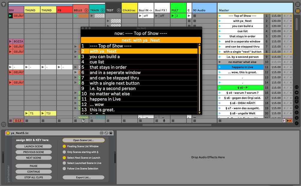 ya_Next allows you to build a cue list out of all scenes or just those starting with "§" in their name. This list is then presented in a separate window (i.e. on a second monitor) and can be stepped through with a single KEY/MIDI button (incl. auto-select next scene on launch)… completely separate from whatever else happens in Live… The show goes on!